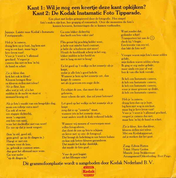 B-side contains instructional lyrics how to use the Kodak Instamatic photo camera.