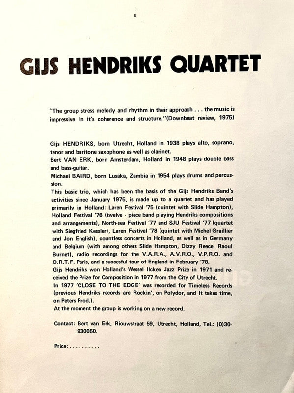 (Labelsticker show the artists name "Gijs Hendriks Kwartet", Cover shows "Gijs Hendriks Quartet")