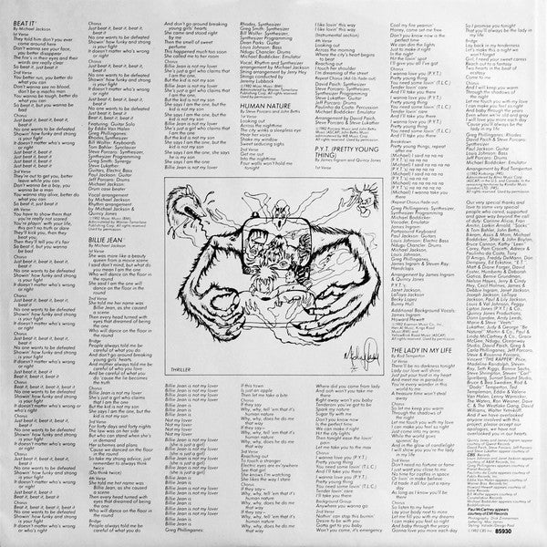 This release differs from others to date with the same catalog number in that the jacket rear has a white barcode at the top right instead of pink, and an additional Sony Music logo at the bottom. The disc labels also have additional references to Sony. Recorded and mixed using the Acusonic Recording Process Aditional Sound Sources Recorded at Ocean Way Recording Studios, Los Angeles, CA Recorded at Westlake Audio, Los Angeles, CA A1, A3, B1, B2: © 1982 Mijac Music (administered by Sony/ATV Songs LLC.) (BMI) A2, A4, B5: © 1982 Rodsongs. All rights for the U.S. and Canada, administered by Almo Music Corp. (PRS) (ASCAP) B3: © 1982 Sony/ATV Tunes LLC & John Bettis Music (ASCAP). All rights on behalf of Sony/ATV Tunes LLC administered by Sony/ATV Music Publishing LLC. B4: © 1982 Warner-Tamerlane Publishing Corp. (BMI) Quincy Jones and James Ingram appear courtesy of Qwest Records David Paich, Steve Porcaro, Jeff Porcaro and Steve Lukather appear courtesy of Columbia Records Louis Johnson and Janet Jackson appear courtesy of A&M Records, Inc. Greg Phillinganes appears courtesy of Solar Records Paulinho da Costa appears courtesy of Pablo Records, Inc. Eddie Van Halen appears courtesy of Warner Bros. Records Inc. Howard Hewett appears courtesy of Solar Records Bill Wolfer appears courtesy of Constellation Records Michael Boddicker appears courtesy of Boddifications ℗ 1982 MJJ Productions Inc. © 1982 MJJ Productions Inc. © 1982, 2015 MJJ Productions Inc. / ℗ 1982 MJJ Productions Inc. Distributed by Epic, a division of Sony Music Entertainment. Sony Music Entertainment International Services GmbH Made in the E.U.