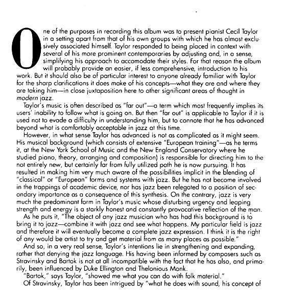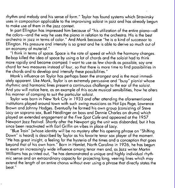 NOTE: Before being issued as COLTRANE TIME in 1962, this album appeared on United Artists in 1959 as STEREO DRIVE under Cecil Taylor's leadership. It is the original liner notes from that first issue that are included here.