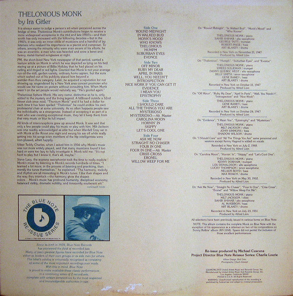 NOTE: This album contains the complete Monk on Blue Note with the exception of his appearance as a sideman on two of his compositions on Sonny Rollins' album ([m225610). Space did not permit the inclusion of those excellent performances.