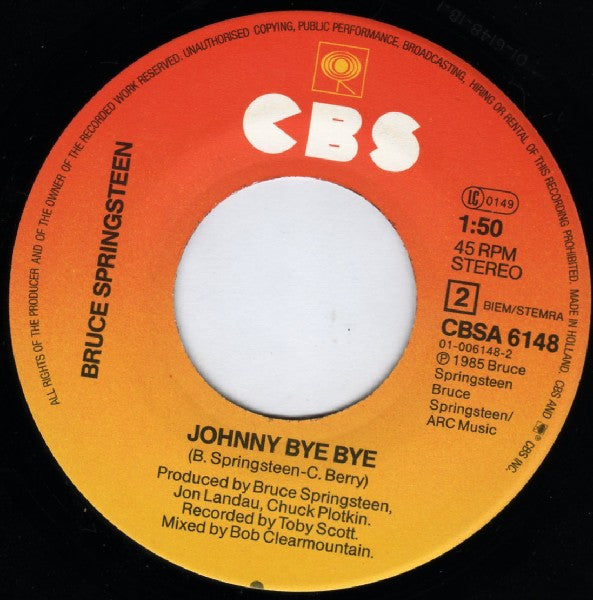 Track A: Taken from the CBS LP "26701" CBS 86304 Bruce Springsteen ℗ 1984 Bruce Springsteen Track B: Bruce Springsteen/ARC Music ℗ 1985 Bruce Springsteen © 1985 Bruce Springsteen Made in Holland Distribution CBS Records/CBS Disques S.A.