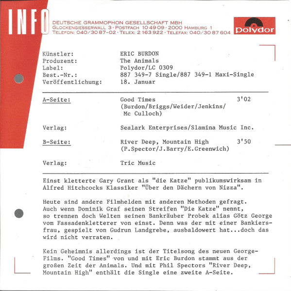Eric Burdon - Good Times (Original Titelmelodie Aus Dem Film »Die Katze«) (7", Single)