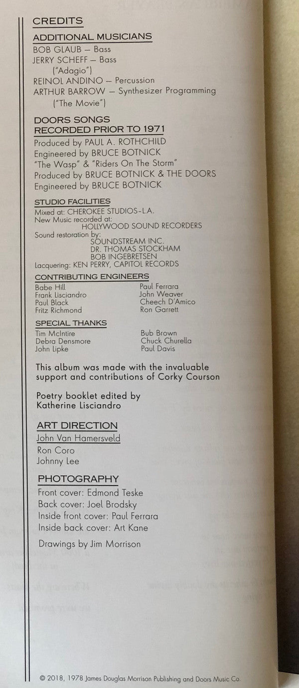 On back cover : RB1 502 ℗ & © 2018, 1978 ELEKTRA RECORDS. All rights reserved. Manufactured for & marketed by Rhino Entertainment LLC, a Warner Music Group Company, 777 S. Santa Fe Ave., Los Angeles, CA 90021. Unauthorized duplication is a violation of applicable laws. Made in the E.U. 603497849871 On grey sticker : NEWLY REMASTERED 180-GRAM BLACK VINYL includes ORIGINAL 8-PAGE ILLUSTRATED LIBRETTO "Moody and mesmerizing... Jim Morrison reading his poetry over The Doors' music" - AllMusic RB1 502 / 603497849871 > 180 gram black vinyl housed in a gatefold jacket with classic white paper & plastic polylined inner sleeve.