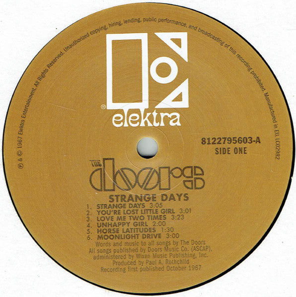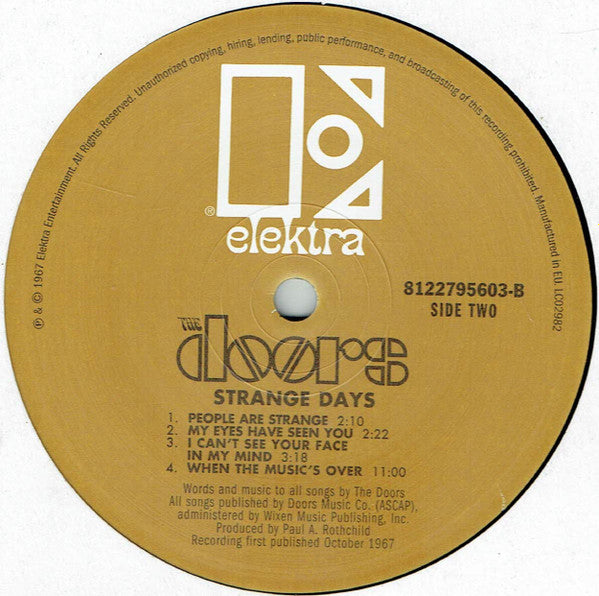Cat# on labels, inner sleeve and hype sticker: 8122795603 Cat# on front cover, back cover and spine: R1-4014 On RSD sticker on shrink wrap: Exclusive Record Store Day On hype sticker on shrink wrap: Original Mono Mixes Hi-Fidelity 180 Gram Virgin Vinyl Featuring: "Love Me Two Times" And "People Are Strange" Rhino Vinyl 8122795603 On back cover: Originally issued as Elektra #EKL-4014 (10/1967) Elektra Entertainment. All Rights Reserved. Manufactured & Marketed by Rhino Vinyl, a Warner Music Group Company, 3400 W. Olive Ave., Burbank, CA 91505-4614. Printed in U.S.A. On inner sleeve: Words and music by The Doors. All songs published by Doors Music Co. (ASCAP), administered by Wixen Music Publishing, Inc. Worlwide Management: Jeffrey Jampol for JAM, Inc. 8122795603 On labels: ℗ & © 1967 Elektra Entertainment. (...) Manufactured in EU. LC02982 Runout details: everything is hand-etched except "TML-M", which is stamped on each side. 2015 Record Store Day exclusive. Limited edition to 12.500 copies, individually numbered (machine stamp printed in green on back cover). 180 gram vinyl housed in single jacket with deluxe plain white paper and plastic polylined inner sleeve. Also included as insert the original inner sleeve with band picture and lyrics. Cat# 8122795603 appears on labels and on the right side of the shrink wrap sticker (US release has "R1-4014" instead).