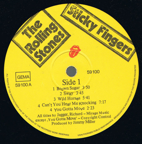 On the cover spine: COC 59100, on the label: 59 100. Misprint on label A, listing "You Gotta Move" as 4 instead of 5. ("Can't you hear me knocking" is track number 4, and "You gotta move" is also number 4.) No WEA on runouts. No Promotone credit. No Label Code on label, insert or cover. No writing at all on back sleeve. Probably original first German release. With thick bronze zipper saying 'ZIPP' on front that unzips to reveal Andy Warhol's white underwear. Later issues had smaller zippers from various manufacturers, but not 'ZIPP'. The runouts are stamped; T.M.L. ROLLING STONES RECORDS is etched. Tracks A1 to A4, B1 to B5: [l266163 Track A5: [l48207