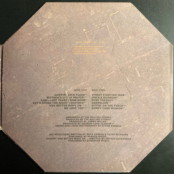 © 1969 The Decca Record Company Limited, London On the labels the (Jagger-Richards) credits are written as (Jagger, Richard). The first inner page features a coloured photograph of the Rolling Stones. The second inner page includes credits, the album track listing and a tribute to Brian Jones: "BRIAN JONES (1943-1969) When this you see, remember me and bear me in your mind Let all the world say what they may speak of me as you find" Published By Mirage Music Except Track A5 Published By Dominion Music. First cat.nr. on cover, second on label. The back cover shows an ''indicator hole'' to let the inner sleeve peep through: blue = stereo, red = mono.Laminated with "Clarifoil" made by British Celenese Ltd Differs From: [r448690: Has a different label layout [r5248822: Has a different label layout side 2 [r5088577: Has a different label layout