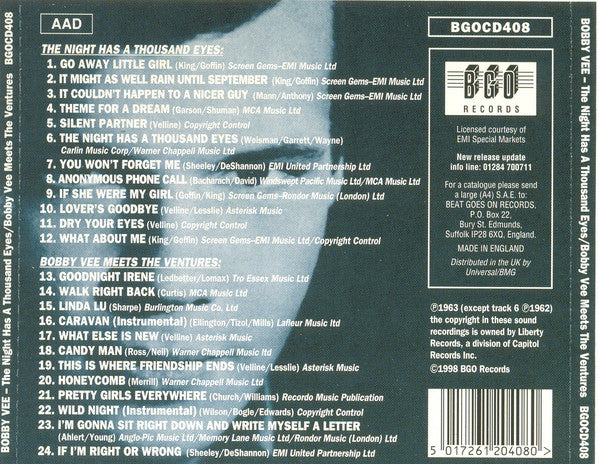 Bobby Vee - The Night Has Thousand Eyes/ Bobby Vee Meets The Ventures (CD, Comp)
