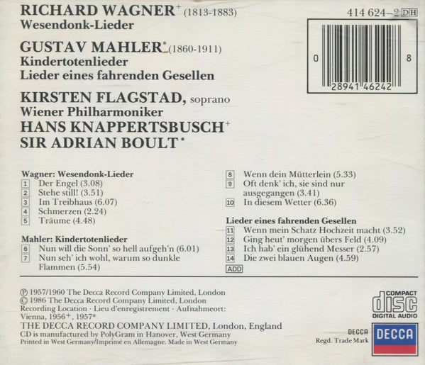 Kirsten Flagstad, Gustav Mahler, Richard Wagner, Wiener Philharmoniker, Hans Knappertsbusch & Sir Adrian Boult - Kindertotenlieder / Lieder Eines Fahrenden Gesellen / Wesendonck Lieder (CD, Comp, RM)