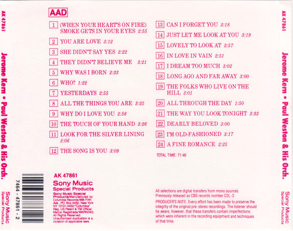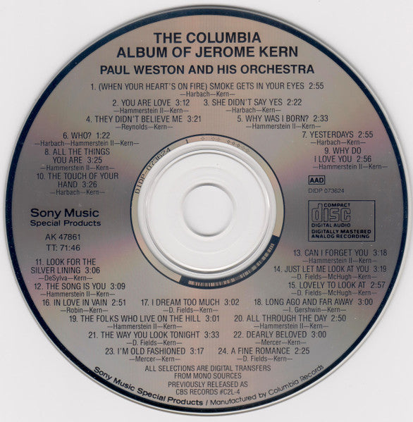 Paul Weston And His Music From Hollywood - The Columbia Album Of Jerome Kern (CD, Album, Mono)
