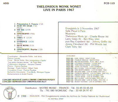 Thelonious Monk Nonet - Live In Paris, 1967 (CD, Album)