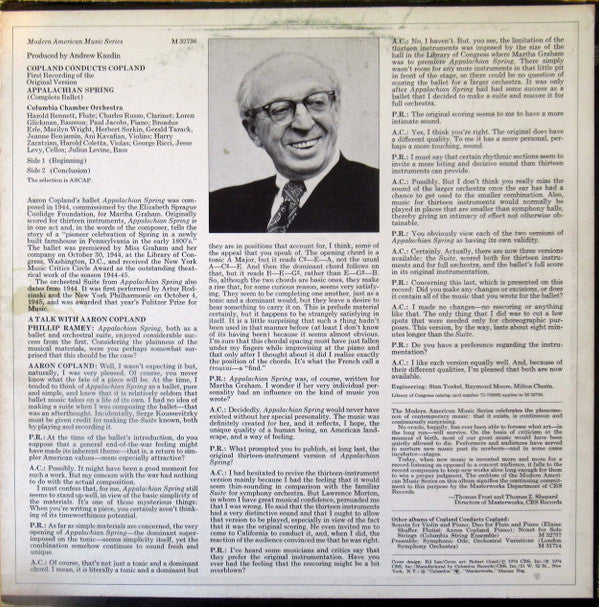 Aaron Copland Conducts Aaron Copland, Columbia Chamber Orchestra - Appalachian Spring (Complete Ballet) (First Recording Of The Original Version) (LP, Album)