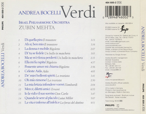 Andrea Bocelli, Israel Philharmonic Orchestra, Zubin Mehta - Verdi (CD, Album)