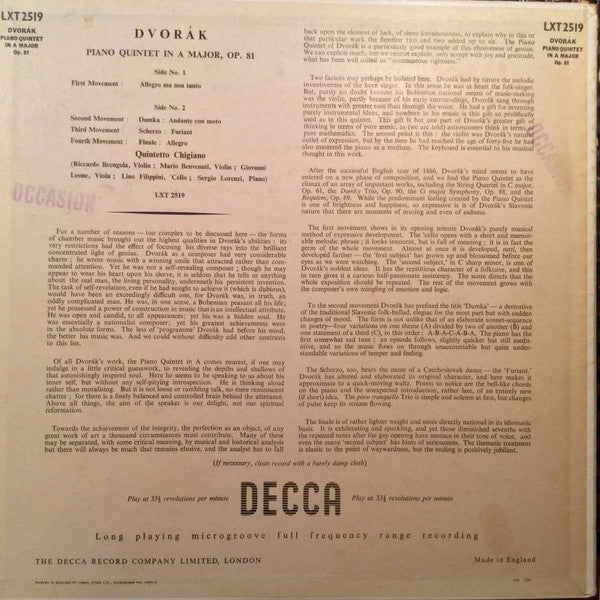 Antonín Dvořák, Quintetto Chigiano - Piano Quintet in A Major, Op. 81 (LP, Mono)
