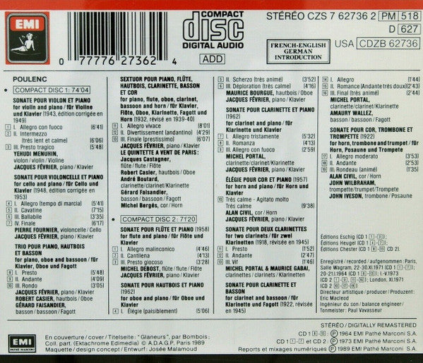 Francis Poulenc - Jacques Février • Yehudi Menuhin • Pierre Fournier • Michel Debost • Alan Civil • Maurice Bourgue • Michel Portal • Le Quintette À Vent De Paris • Amaury Wallez • Maurice Gabai • John Wilbraham • John Iveson