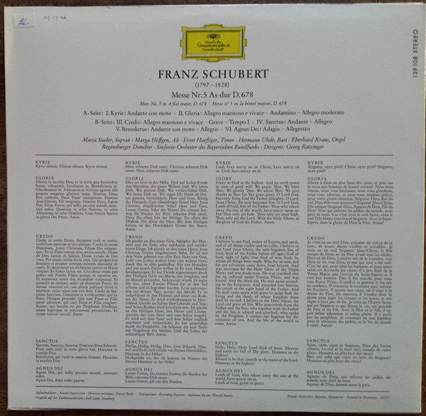 Title on sleeve: Messe As-Dur . Mass In A Flat Major . Messe En La Bémol Majeur