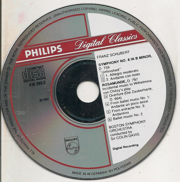 Franz Schubert, Sir Colin Davis, Boston Symphony Orchestra - Symphony No. 8 Unfinished = Unvollendete; Rosamunde, Incidental Music = Schauspielmusik (CD, Album, RE)