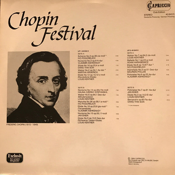 Frédéric Chopin, Ivo Pogorelich, Vladimir Ashkenazy, Dang Thai Son, Martha Argerich, Louis Kentner, Halina Czerny-Stefańska, Adam Harasiewicz, Maurizio Pollini, Jan Ekier - Chopin Festival (2xLP, Comp, Club, Gat)