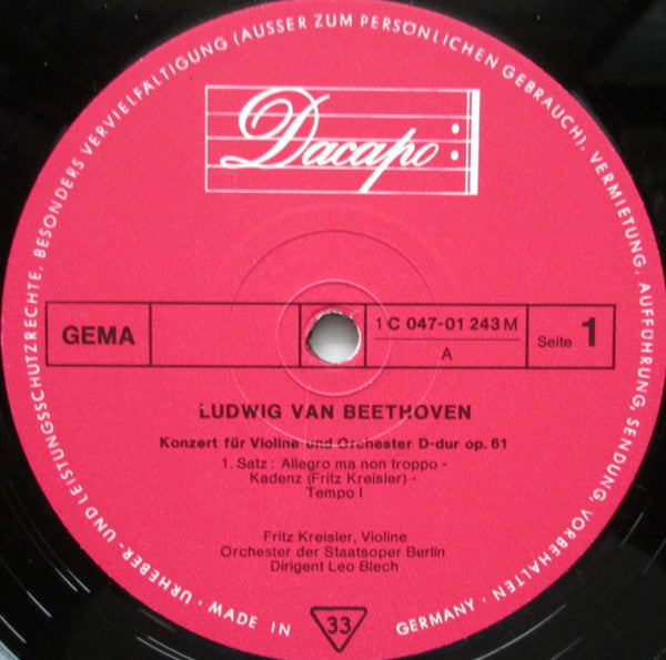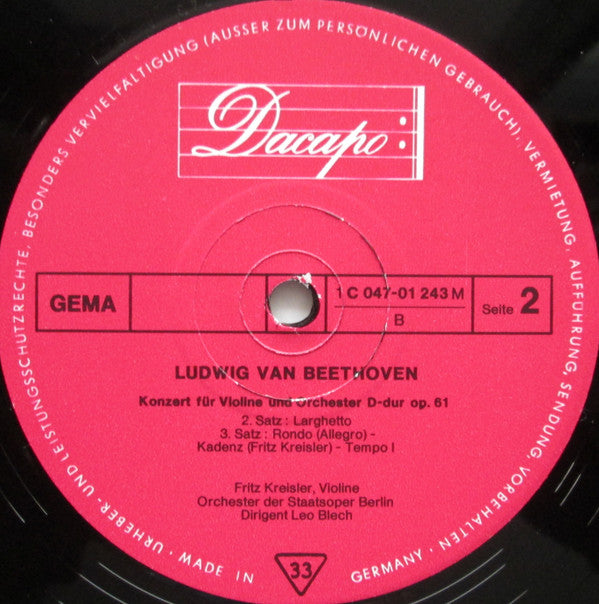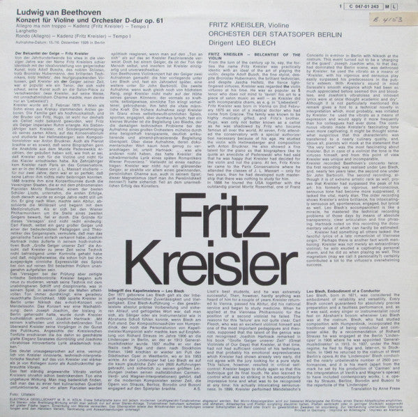 Fritz Kreisler, Das Orchester Der Staatsoper Berlin, Leo Blech, Ludwig van Beethoven - Violinkonzert D-dur Op. 61 (LP, Mono)