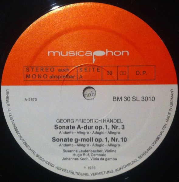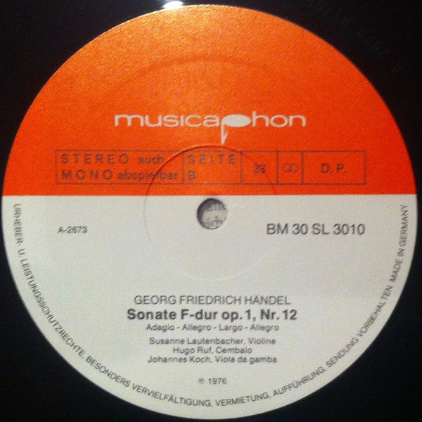 Georg Friedrich Händel, Susanne Lautenbacher, Hugo Ruf, Johannes Koch - Susanne Lautenbacher, Hugo Ruf, Johannes Koch Spielen Sechs Sonaten Für Violine Und Basso Continuo Von Georg Friedrich Händel (Folge I) (LP, RE)