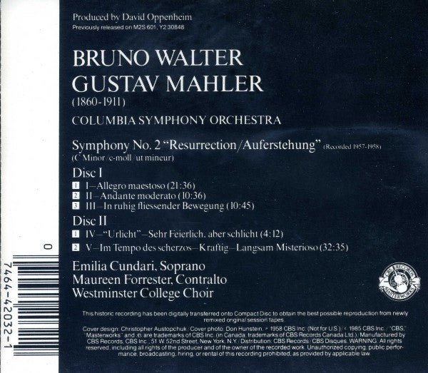Gustav Mahler, Bruno Walter, Emilia Cundari, Maureen Forrester, Westminster Choir, New York Philharmonic - Symphony No. 2 "Resurrection" (2xCD, RE, RM)