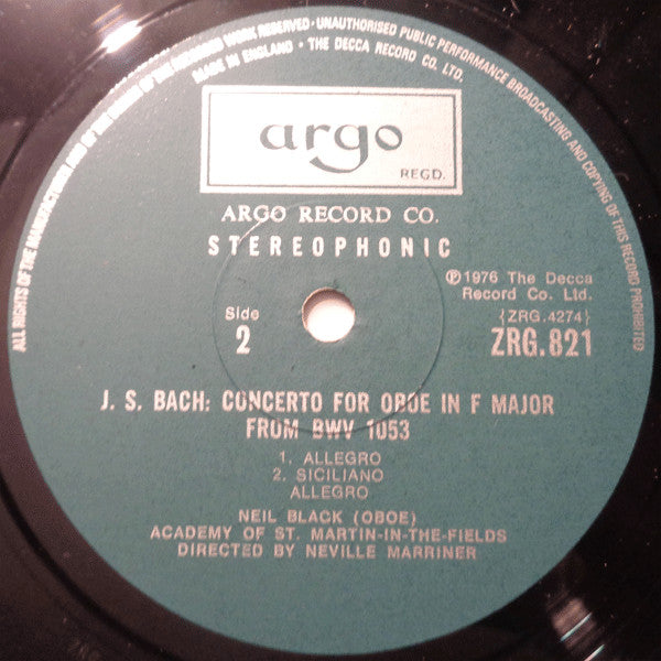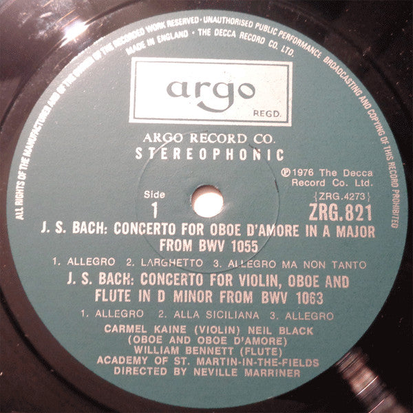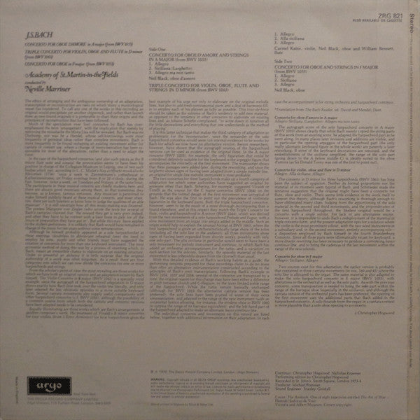 The spine has "J.S. Bach: Concertos For Oboe D'Amore/Violin, Oboe And Flute/Oboe Academy of St. Martin-in-the-Fields/Marriner Argo Ⓢ ZRG 821"