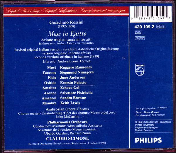Gioacchino Rossini, Ruggero Raimondi, Siegmund Nimsgern, June Anderson, Philharmonia Orchestra, Claudio Scimone - Mosè In Egitto (2xCD, RE, RM)
