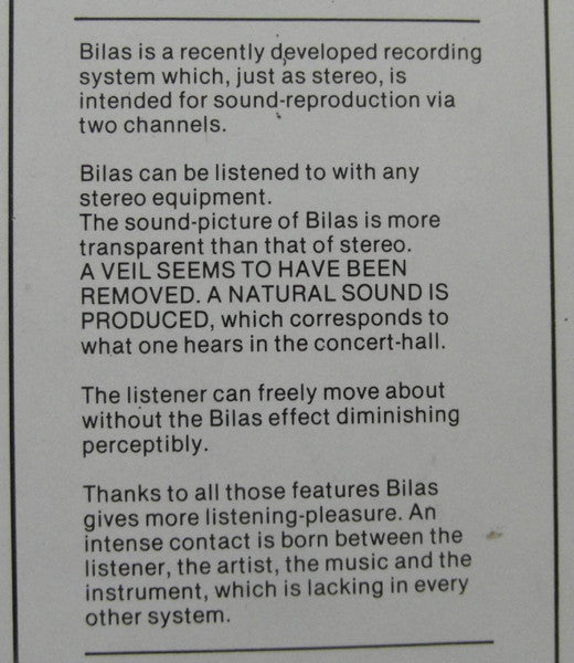 Bilas is a recently developed recording system which, just as stereo, is intended for sound-reproduction via two channels.