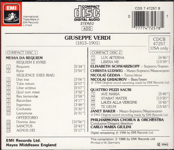 Giuseppe Verdi, Elisabeth Schwarzkopf, Christa Ludwig, Nicolai Gedda, Nicolai Ghiaurov, Janet Baker, Carlo Maria Giulini, Philharmonia Chorus & Philharmonia Orchestra - Requiem / Quattro Pezzi Sacri (2xCD, Comp, RM)