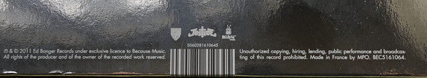 Recorded in Paris 2010 - 2011 Mastered by Nilesh Patel at The Exchange, London. ℗ & © 2011 Ed Banger Records under exclusive license to Because Music. All rights of the producer and of the owner of the recorded work reserved. Unauthorized copying, hiring, lending, public performance and broadcasting of this record prohibited. Made in France by MPO. On black front sticker : JUSTICE NEW ALBUM LIMITED EDITION DOUBLE VINYL + CD Includes CIVILIZATION & AUDIO, VIDEO, DISCO. > 2019 reissue of [r=3185083, with different labels (gold/brown color) and runout. Gatefold jacket and heavy gauge protective printed inner sleeves with liner notes by Pedro Winter and credits. Tracks are numbered sequentially on both cover & labels.