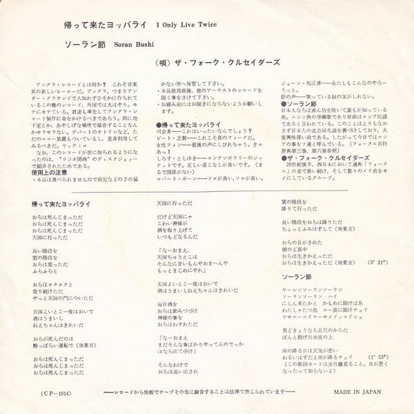 Folk Crusaders = Folk Crusaders - 帰って来たヨッパライ / ソーラン節 = I Only Live Twice / Soran Bushi (7", Single)