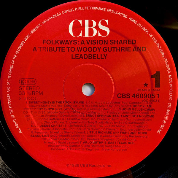 Issued in a gatefold sleeve, some copies with a sticker stating: 'A Musical Tribute To Woody Guthrie & Leadbelly' and listing featured artists. Red CBS labels; Made in Holland. Comes with printed inner sleeve with lyrics and credits