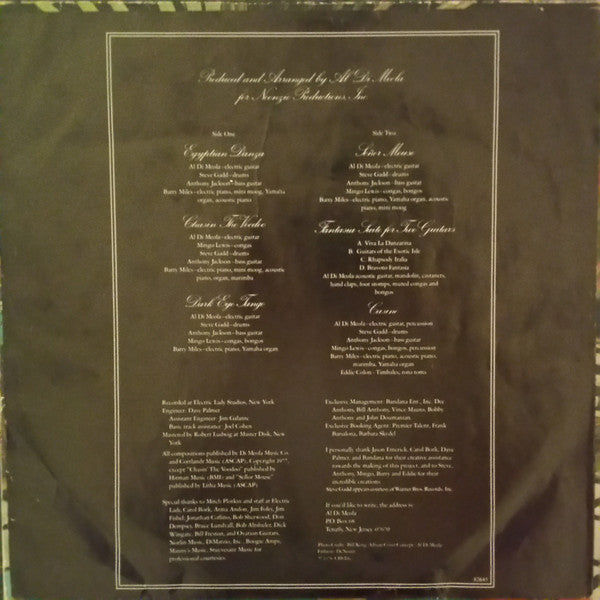 Detailed credits on inner sleeve, with close-up photo of Al Di Meola on the other side.