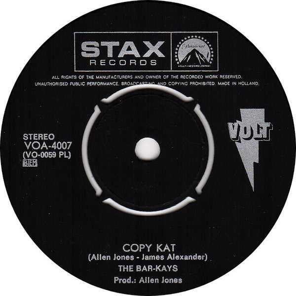 Artist as printed on both center labels: "The Bar-Kays", and on center label side A track A as: "Copy Kat".