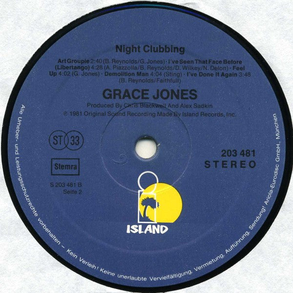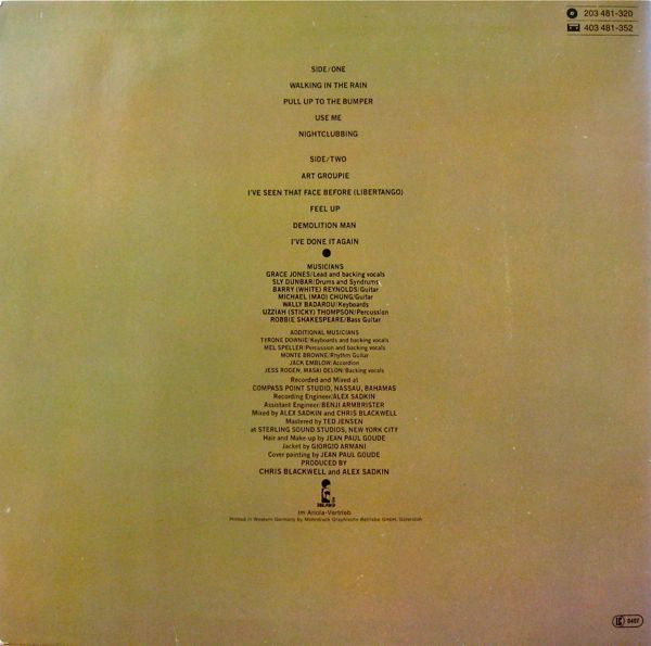 Recorded and mixed at Compass Point Studio, Nassau, Bahamas. Mastered at Sterling Sound Studios, New York City. Im Ariola-Vertrieb Printed in Western Germany by Mohndruck Graphische Betriebe GmbH, Gütersloh ℗ 1981 Original Sound Recording Made By Island Records, Inc. Labels: Island Records Labelring: Ariola-Eurodisc GmbH, München A slightly different Stemra exists with Ariola Benelux B.V. Haarlem in the labelring
