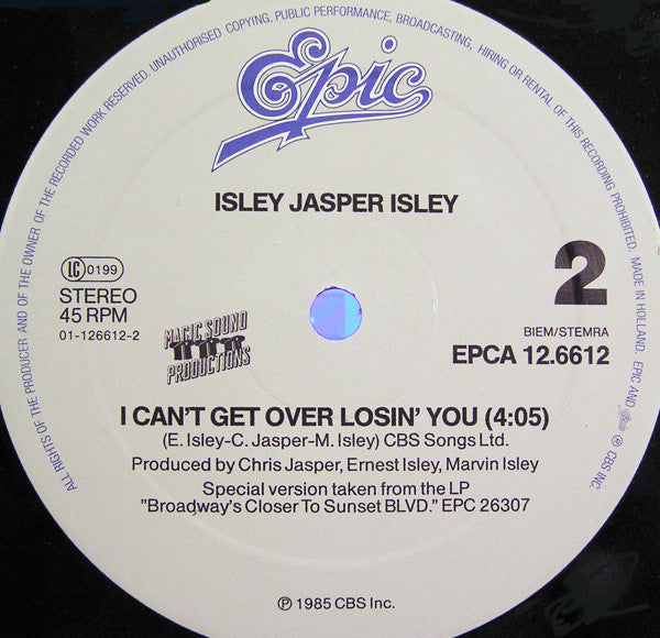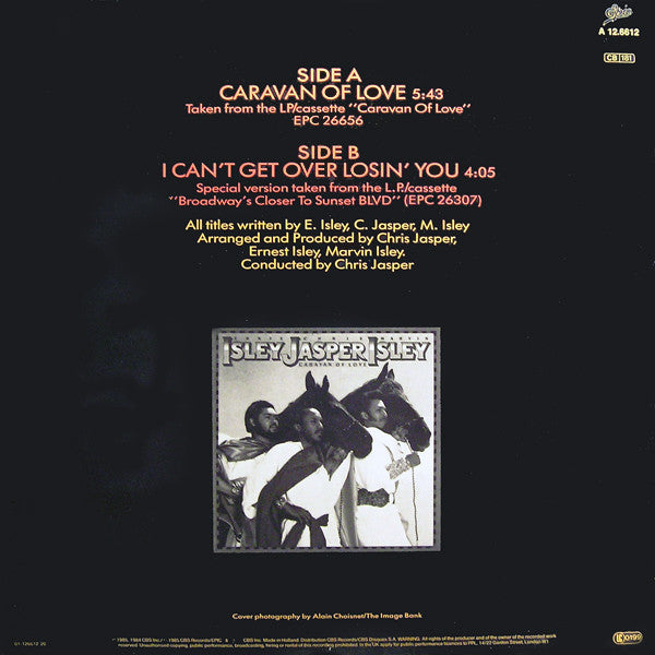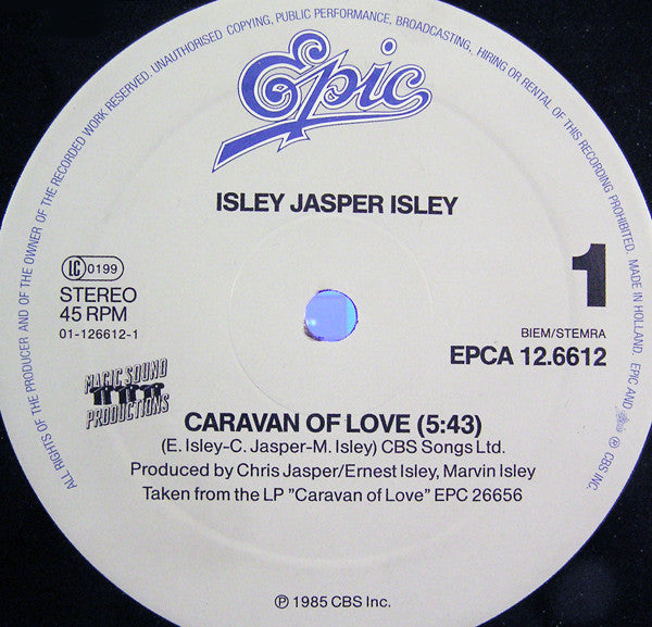 [Label side A Taken from the Lp "Caravan of Love" EPC 26656 ℗ 1985 CBS Inc. Made in Holland [Logo: Magic Sound Productions [Label side B Special version taken from the Lp "Broadway's Closer To Sunset BLVD."EPC 26307 ℗ 1985 CBS Inc. Made in Holland [Logo: Magic Sound Productions [Cover rear ℗ 1985,1984 CBS Inc / © 1985 CBS Records/Epic & CBS Inc. Made in Holland Distribuition CBS Records/CBS Disques S.A. 1st catalog# appears spine and front/back of sleeve 2nd catalog# appears on labels