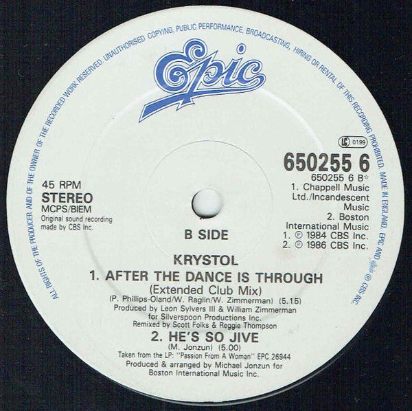 Label side A: Alexandra Kee Music / Aujourd Hui Publishing ℗ 1986 CBS Inc. Taken from the LP "Passion From A Woman" EPC 26944 Label side B: 1. Chappell Music Ltd. / Incandescent Music 2. Boston International Music 1. ℗ 1984 CBS Inc. 2. ℗ 1986 CBS Inc. 2. Taken from the LP "Passion From A Woman" EPC 26944