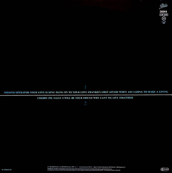 - Grey labels, therefore released at earliest mid-1985. The first pressings had black/blue labels. - "Made in Holland" on labels and back cover - ℗ 1984 CBS Records on labels - ℗ 1984 CBS Records/© 1984 CBS Records on back - Some copies came with sticker as seen here (promoting 4 songs of the album) or with other, bigger sticker (promoting 5 songs) as seen on [r=8897144. - Different timing from labels and cover. - Similar to [r=27814326 but without a barcode and a different price code. All runout variants have at least predominantly stamped parts (01-26044-#A-1 /#A1 respectively 01-26044-#B-1/#B1/#B 1), all trailing AND solitary letters are most likely etched. Runout exceptions / individual evidences: - Variant 02, side A|B: all stamped, except for the etched trailing 'C' and 'A' - Variant 03, side A|B: all stamped - Variant 06, side A: all etched | side B: all stamped - Variant 07, side A|B: all stamped, except for the etched 'C' - Variant 08, side A|B: all stamped - Variant 09, side A: all etched | side B: stamped/etched - Variant 10, side A: all etched (handwritten etchings are much different than on var. 9) | side B: stamped - Variant 11, side A|B: all stamped except the "ට" on side B which is etched