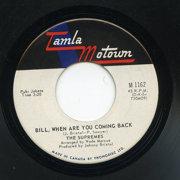 Black and white Tamla Motown labels. Distributed in a Tamla Motown sleeve. Pub: Jobete Made in Canada by Phonodisc Ltd. No date on release.