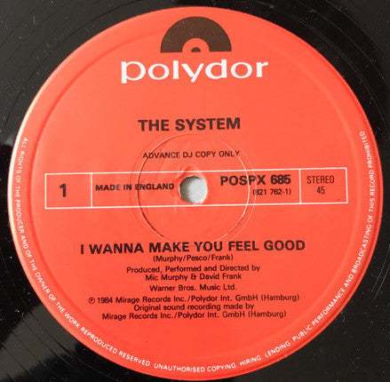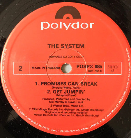 ℗ 1984 Mirage Records Inc. / Polydor Int. GmbH (Hamburg) © 1984 Polydor Ltd. (London) Made in England Both labels have "ADVANCE DJ COPY ONLY"