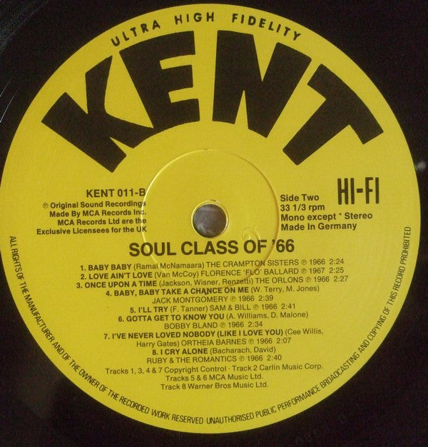 "okay so they're not all 1966; they're two years either side, it's called poetic license in posh circles!" Mono except: A4 ℗ Original sound recordings made by MCA Records Inc. MCA Records Ltd are the exclusive licensees for the UK. © 1983 Ace Records Ltd Copyright Control: A1, A3, A4, A5, B1, B3, B4, B7 MCA Music Ltd.: A2, B5, B6 EMI Music Pub Ltd.: A6 Screen Gems-EMI Music Ltd.: A7 Westminster Music Ltd.: A8 Carlin Music Corp.: B2 Warner Bros Music Ltd.: B8 ℗ 1964: A8, B1, B3, B4, B5, B6, B7, B8 ℗ 1965: A1, A6, A7 ℗ 1966: A2, A3 ℗ 1967: A4, A5, B2 Runouts stamped except etched "020"
