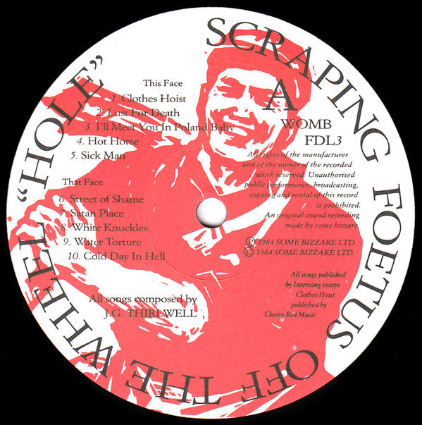Version with sleeve art in red and black only. First issue with sleeve art printed in black, red and rust brown is here: [r12912882 Recorded May-October 1983 at Wave Studios, London (except Clothes Hoist [A1 recorded at Lavender Sound, tarted up at Wave Studios). All songs published by Intersong except Clothes Hoist published by Cherry Red Music Ltd. ℗ 1984 Some Bizzare Ltd. © 1984 Some Bizzare Ltd. Side A named 'This Face'. Side B named 'That Face'. Include folder sheet with song lyrics and (uncredited) graphic design by J.G. Thirlwell.