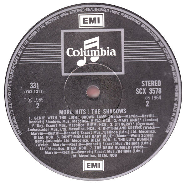 Nearly identical release to UK re-issue: [r=4342993. This issue doesn't have "Made In Gt Britain" printed on labels. Silver print on black EMI/Columbia labels A-side: ℗ 1963 ℗ 1964, B-side: ℗ 1964 ℗ 1965 A1: Elstree Mus. Ltd. Mecolico. BIEM. NCB A2: F. Day & Hunter Ltd. A3: Escort Mus./Belinda (Ldn.) Ltd. Mecolico. BIEM. NCB. A4: Escort Mus./Elstree Mus. Mecolico. BIEM. NCB. A5: Escort Mus./Belinda (Ldn.) Ltd. Mecolico. BIEM. NCB. A6: Burlington Mus. Ltd. Southern. NCB. A7: Escort Mus./Belinda (Ldn.) Ltd. Mecolico. NCB. BIEM. B1: Shadows Mus. Mecolico. BIEM. NCB. B2: F. Day. Escort Mus. Mecolico. BIEM. NCB. B3: Ambassador Mus. Ltd. Mecolico. NCB. B4: Escort Mus./Belinda (Ldn.) Ltd. Mecolico. BIEM. NCB. B5: Screen Gems-Columbia Ltd. Mecolico. BIEM. NCB. B6: Escort Mus./Belinda (Ldn.) Ltd. Mecolico. BIEM. NCB. B7: Escort Mus./Belinda (Ldn.) Ltd. Mecolico. BIEM. NCB