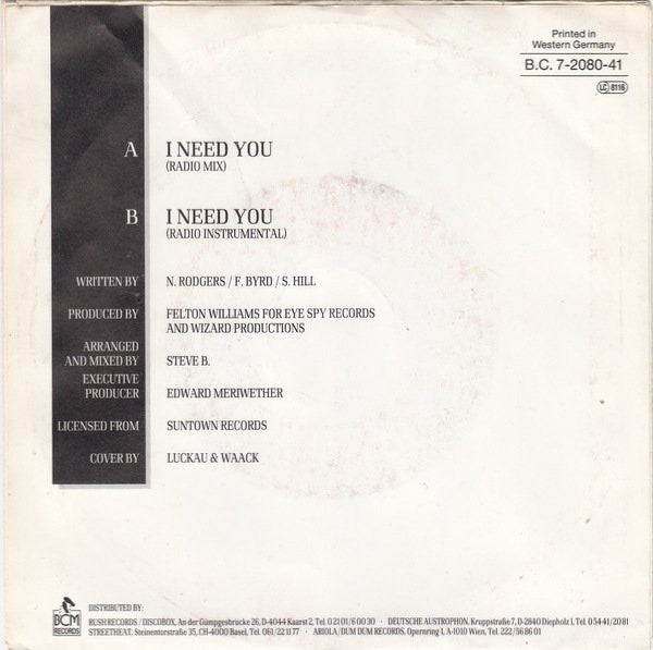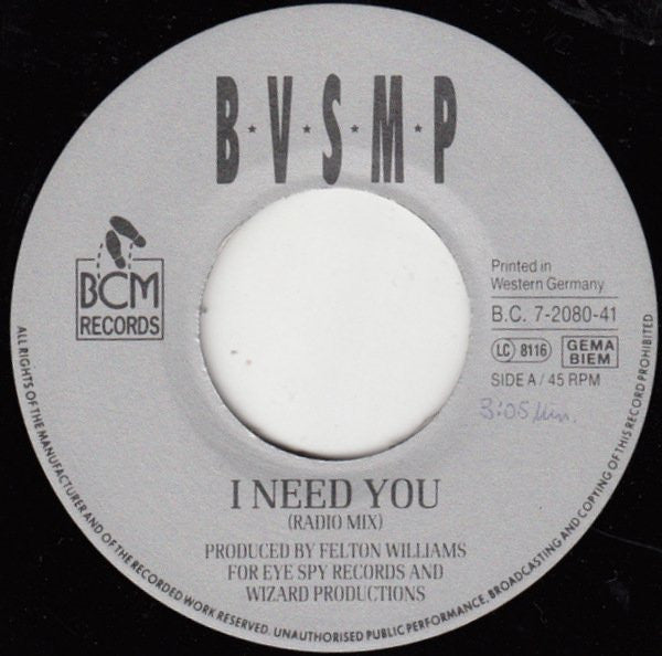 B.V.S.M.P. - I Need You (7", Single, Big)