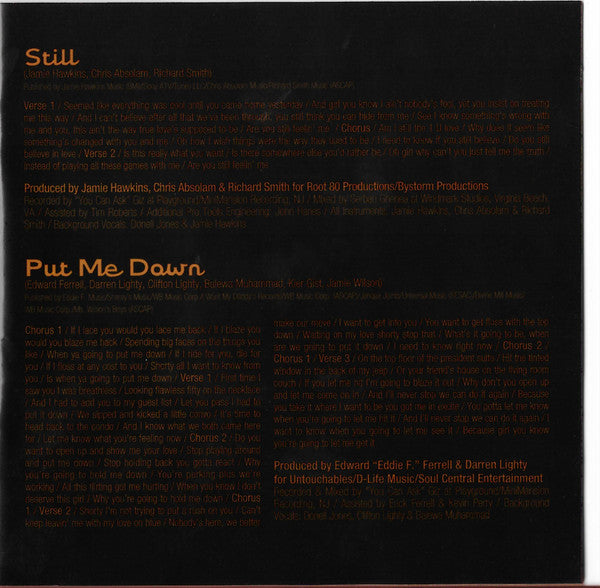 Published by Eddie F. Music/Sharay's Music/WB Music Corp./I Want My Daddy's Records/WB Music Corp. (ASCAP)/Jahqae Joints/Universal Music (SESAC)/Divine Mill Music/WB Music Corp./Ms. Wilson's Boys (ASCAP)