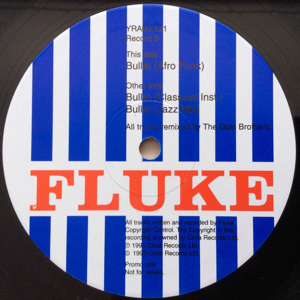 Some versions comes in a Tesco look alike plastic bag. The name "Tesco" is replaced with "Fluke". On label, Side A: 'YRADJ 121 Record 3 Promo only Not for resale.' ((Records 1+2 being [r114973) Track durations not present on release.