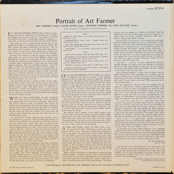 Recorded in New York City, April 19 & May 1, 1958 under the supervision of Nat Hentoff.