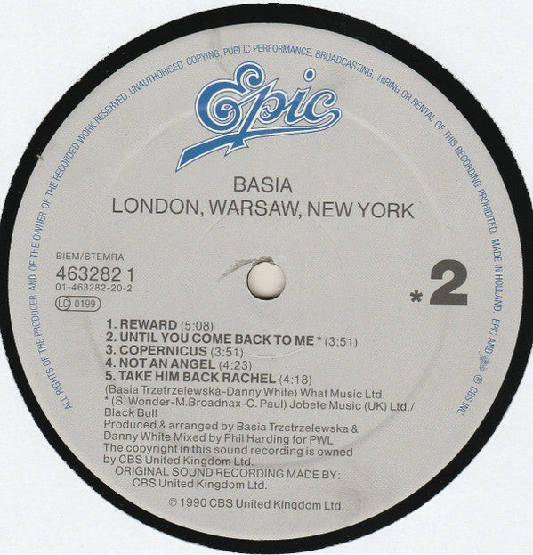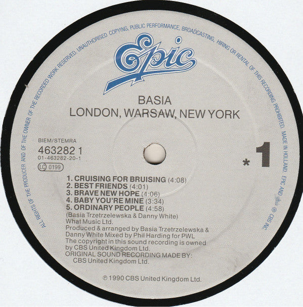 ℗ 1990 CBS United Kingdom Ltd. / Epic & Epic (logo) © 1990 CBS Inc. Distribution CBS Records. Recorded at Eden Studios, London. Mixed for PWL. Published by What Music Ltd. (except track B2 published by Jobete Music UK Ltd. / Black Bull Music). Also available, the debut album "Time And Tide". Made in Holland. Album title is spelled "London, Warsaw, New York" on labels. Some copies come with a sticker attached to front cover: Includes The Hit Singles "Baby You're Mine" "Cruising For Bruising"