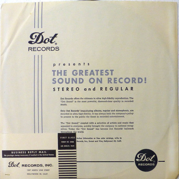 The vinyl comes in the original Dot records inner sleeve, and some copies include a pre-paid postal card, to order the Dot catalog, stapled to the corner of the innersleeve.
