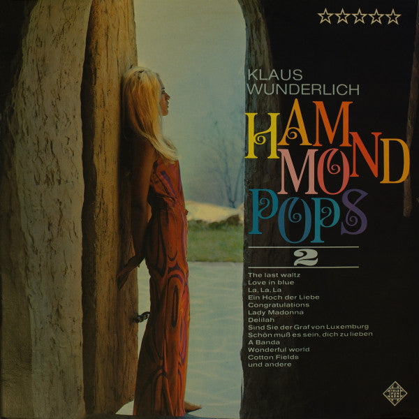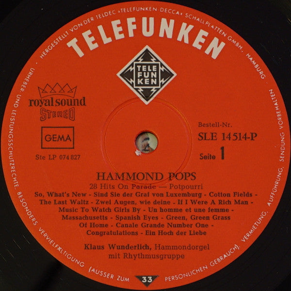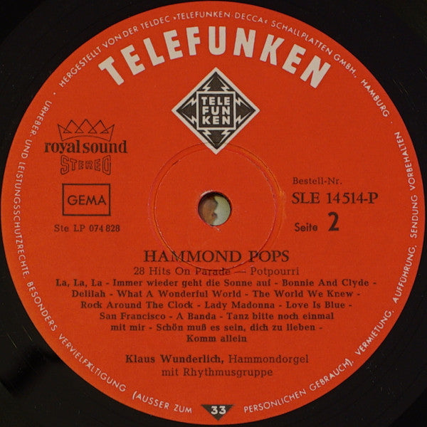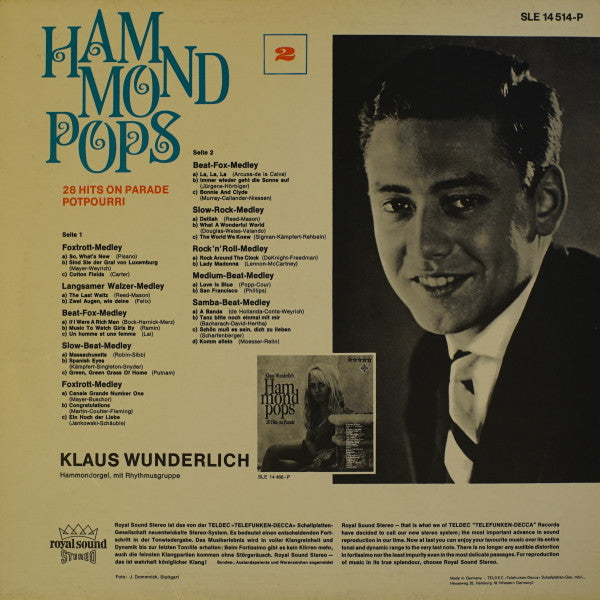 "Hammond Pops 2 - 28 Hits On Parade" Side 1-1 "Foxtrott-Medley" a) (Pisano) b) (Mayer-Weyrich) c) (Carter) Side 1-2 "Langsamer Walzer-Medley" a) (Reed-Mason) b) (Felix) Side 1-3 "Beat-Fox-Medley" a) (Bock-Harnick-Merz) b) (Ramin) c) (Lai) Side 1-4 "Slow-Beat-Medley" a) (Robin-Sibb) b) (Kaempfert-Singleton-Snyder) c) (Putnam) Side 1-5 "Foxtrott-Medley" a) (Mayer-Buschor) b) (Martin-Coulter-Fleming) c) (Jankowski-Schäuble) Side 2-1 "Beat-Fox-Medley" a) (Arcusa-de la Calva) b) (Jürgens-Hörbiger) c) (Murray-Callandar-Niessen) Side 2-2 "Slow-Rock-Medley" a) (Reed-Mason) b) (Douglas-Weiss-Valando) c) (Sigman-Kaempfert-Rehbein) Side 2-3 "Rock'n'Roll-Medley" a) (DeKnight-Freedman) b) (Lennon-McCartney) Side 2-4 "Medium-Beat-Medley" a) (Popp-Cour) b) (Phillips) Side 2-5 "Samba-Beat-Medley" a) (de Hollanda-Conta-Weyrich) b) (Bacharach-David-Hertha) c) (Scharfenberger) d) (Moesser-Relin) Klaus Wunderlich, Hammond Organ with Rhythmsection